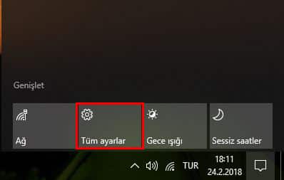 - İlk yapacağımız işlem sağ alt köşedeki bildirimler butonuna tıklamak. Buradan da tüm ayarlar seçeneğini seçeceğiz.