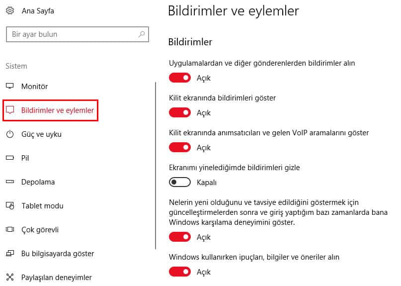 - Buradan da soldaki ikinci sekmeden “Bildirimler ve Eylemler” yazısına tıklıyoruz.